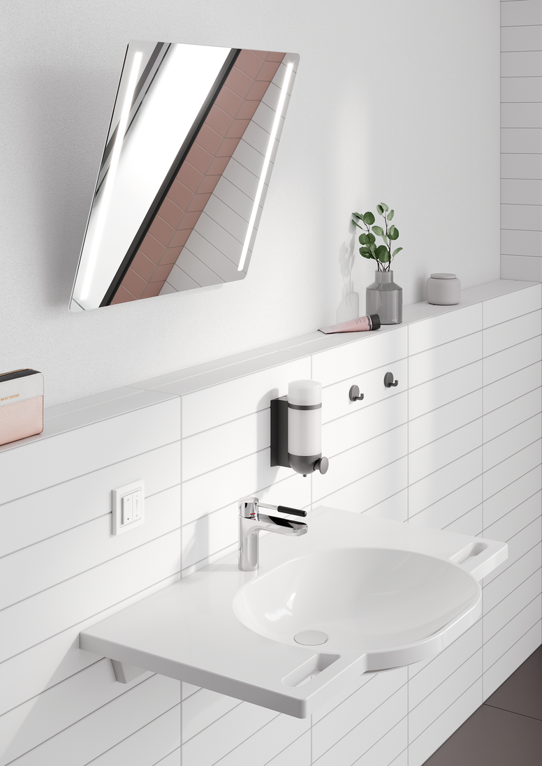 Ein weiterer wichtiger Aspekt bei Deiner Badezimmer Sanierung ist der Spiegel am Waschtisch. Besonders, wenn Du auf einem Hocker sitzt oder auf einen Rollstuhl angewiesen bist, kann es schwierig sein, Dich im Spiegel zu sehen. Unsere Kippspiegel bieten eine praktische Lösung: Sie lassen sich leicht in der Neigung verstellen, sodass Du Dich immer gut im Spiegel betrachten kannst. Alternativ gibt es auch durchgehende Spiegel, die bis zur Oberkante des Waschtisches reichen und ohne Verstellung den optimalen Blickwinkel für alle garantieren.