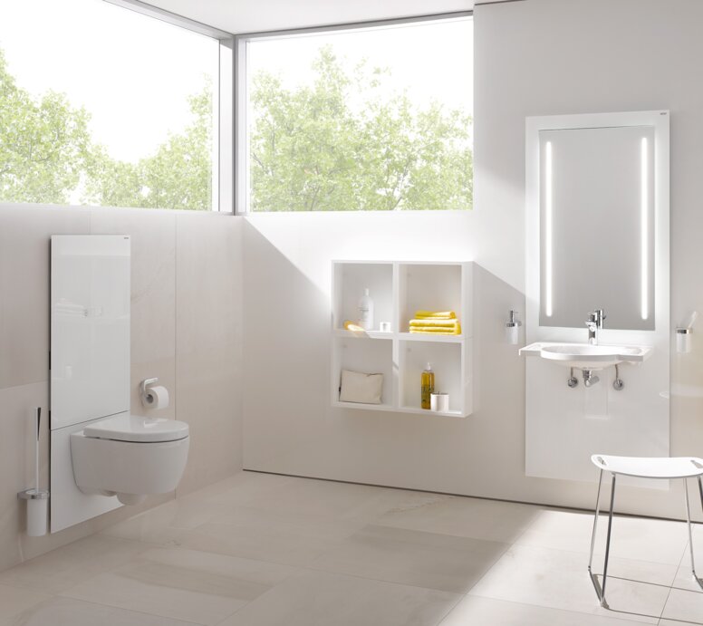 Bedienelemente wie Armaturen, Lichtschalter oder Brausehalter sollten so positioniert werden, dass sie aus sitzender und stehender Position leicht erreichbar sind. Die DIN 18040 empfiehlt hier Montagehöhen