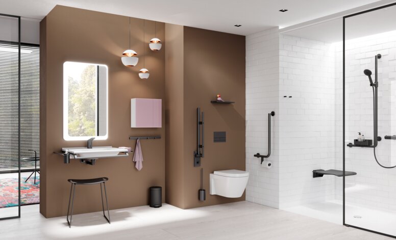 Eine zukunftssichere Badplanung sieht Montagevorbereitungen für Hilfsmittel wie Stützklappgriffe oder Duschsitze bereits in der Bau- oder Sanierungsphase vor – auch dann, wenn sie zunächst nicht installiert werden. HEWI bietet hierzu Systeme wie System 900, bei denen Haltevorrichtungen stilvoll vorgerüstet und bei Bedarf jederzeit ergänzt werden können.