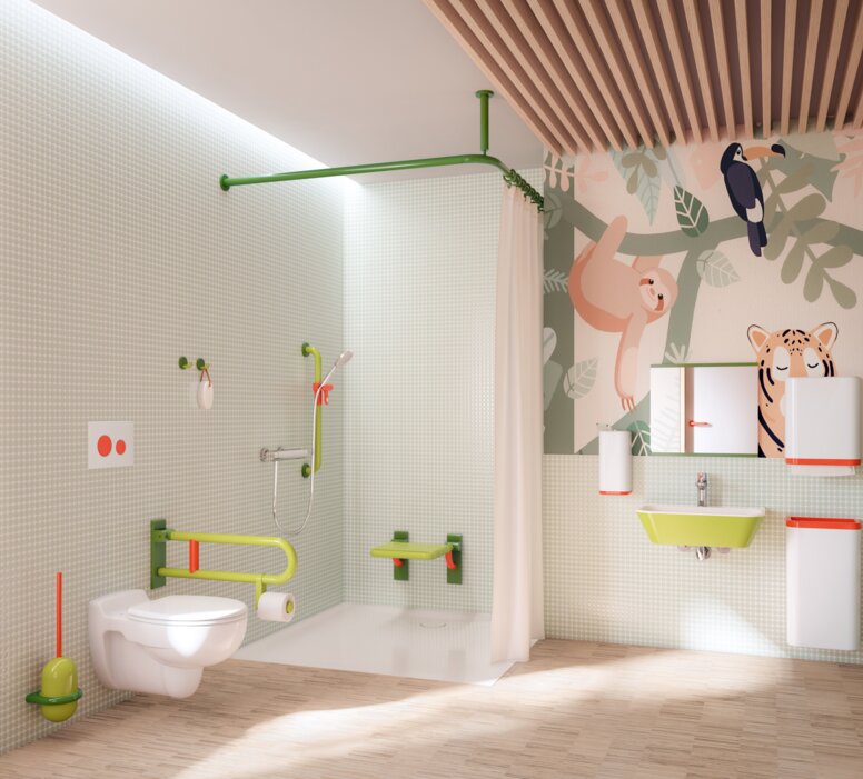 Die Gestaltung von Sanitäranlagen in Kindergärten erfordert eine detaillierte Planung, um den hohen Anforderungen an Sicherheit und Hygiene gerecht zu werden. HEWI unterstützt Sie als ArchitektInnen und PlanerInnen dabei.