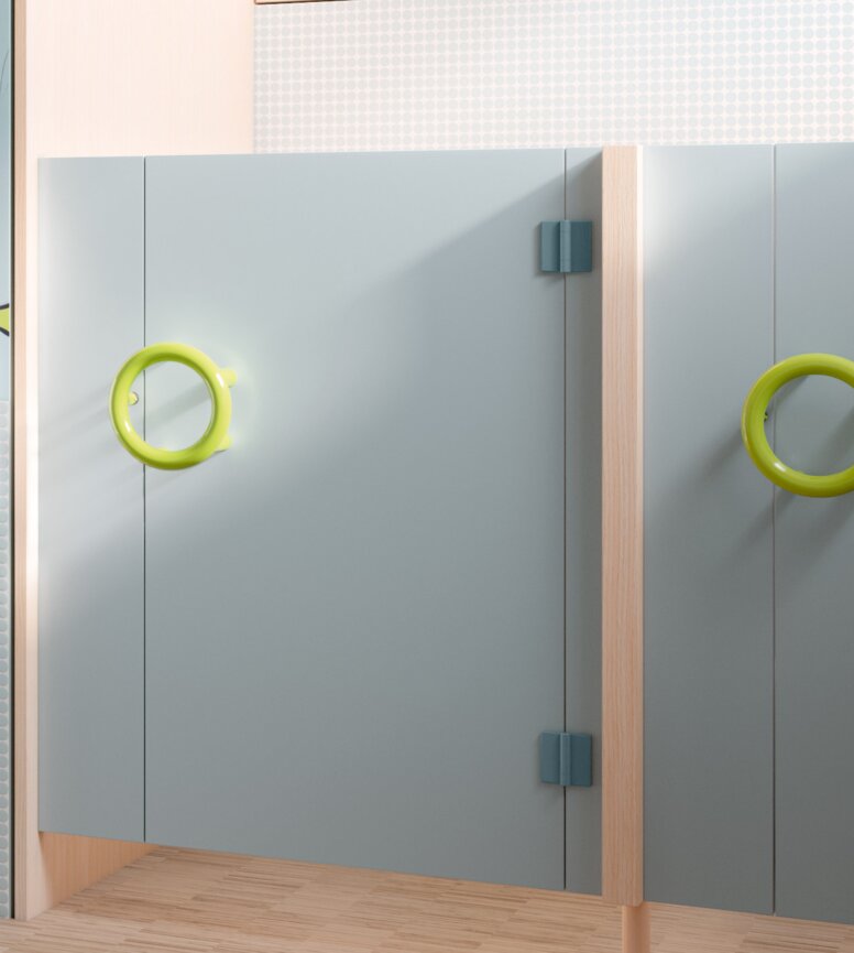 Die Höhe der WC-Trennwände im Kindergarten ist so gestaltet, dass sie die Privatsphäre der Kinder wahrt, aber gleichzeitig eine ausreichende Aufsicht durch Betreuungspersonen ermöglicht. HEWI bietet zudem Zubehör wie bedienfreundliche Griffe in kreisrunder und bogenförmiger Ausführung sowie kindgerechte Verriegelungen, die eine einfache und sichere Bedienung für die Kleinen gewährleisten. Mit den Aufschraubbändern komplettieren Sie die WC-Trennwand im Kindergarten.