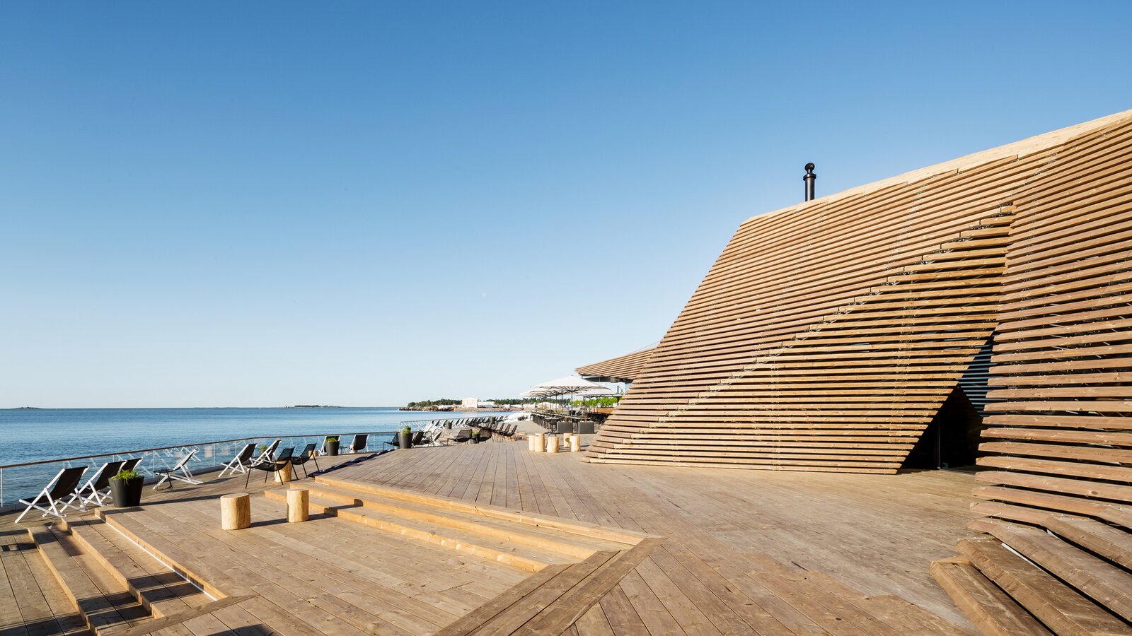 Die Sauna liegt gerade mal zwei Kilometer vom Stadtzentrum Helsinkis entfernt. Trotzdem liegt sie bereits in den äußeren Schären und wird Teil des Helsinki-Parks, der die finnische Hauptstadt mit dem Meer verbinden wird.