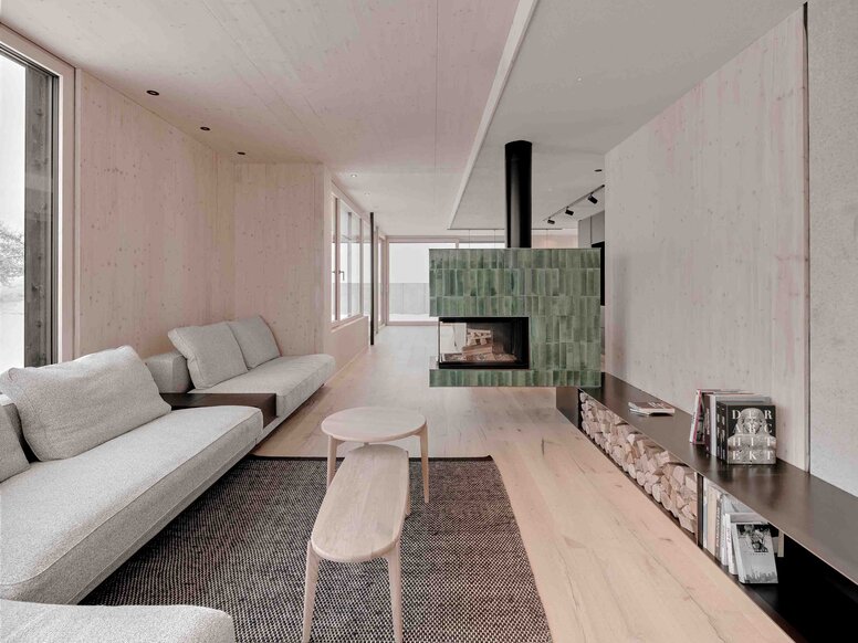 Im Inneren setzt sich die Logik des Baukörpers fort. Das Untergeschoss nimmt private Rückzugsbereiche, Schlaf- und Arbeitsräume sowie einen kleinen Saunabereich auf. Es ist introvertiert, still und von zurückhaltender Materialität wie hellem Holz, Sichtbeton und Glas geprägt. Darüber öffnet sich das Erdgeschoss zu einem großzügigen Wohn- und Aufenthaltsraum. Eine schwarze Kücheninsel und ein grün gekachelter Ofen bilden den Mittelpunkt des gemeinschaftlichen Lebens. Ess- und Wohnbereich lassen sich über Schiebetüren unmittelbar in den Garten erweitern, während gezielte Sichtachsen die Verbindung zur Landschaft intensivieren.