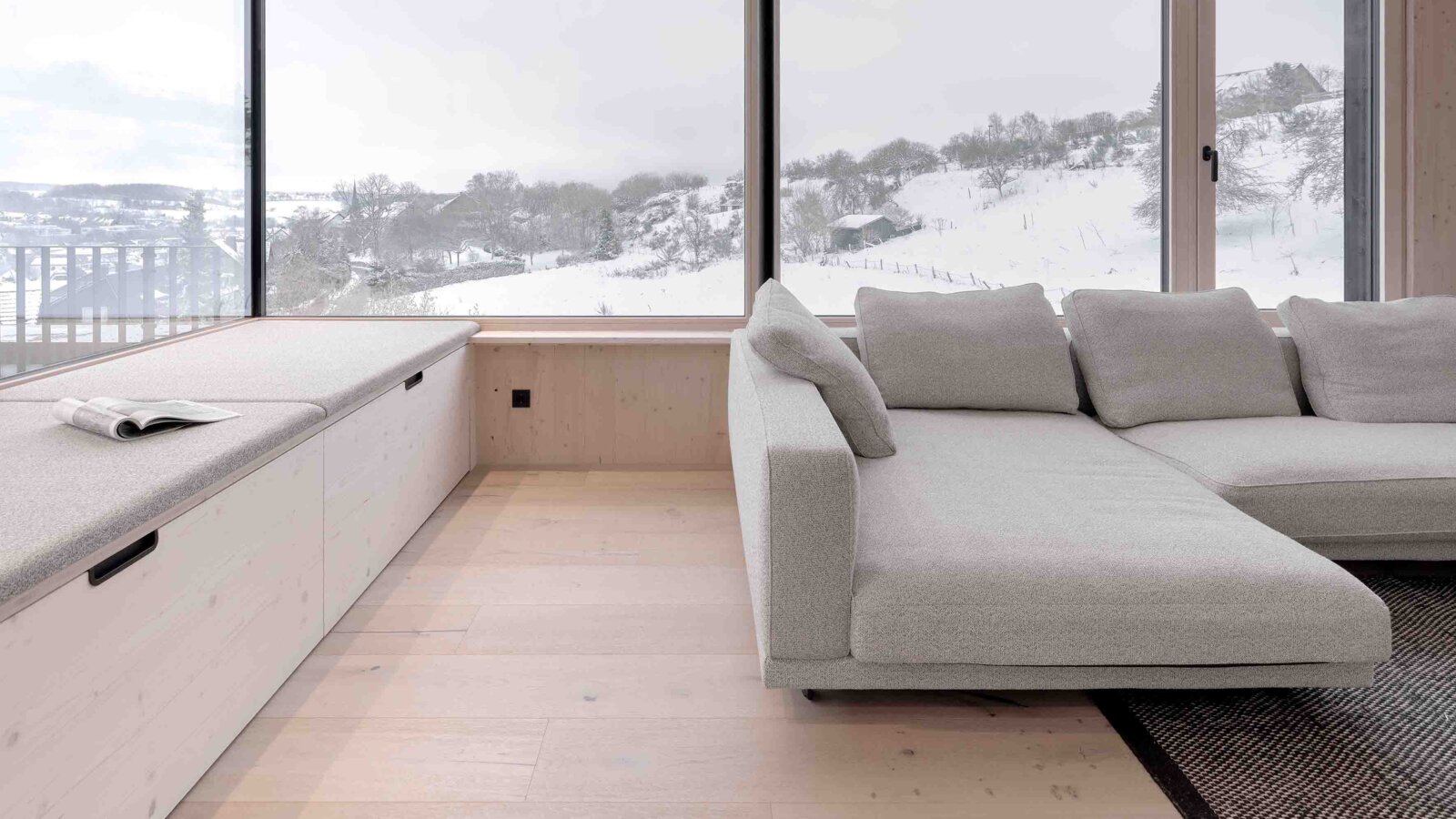 Das architektonische Konzept basiert auf dem Dialog der Materialien. Sichtbeton als Fundament ist dauerhaft, lasttragend und robust. Dem gegenüber steht das warme Holz der oberen Geschosse, das für Leichtigkeit, Offenheit und Lebensnähe steht. „Diese Gegensätze sind kein Widerspruch, sondern die eigentliche Stärke des Hauses“, betont Schönauer. In diesem Spannungsfeld entfaltet sich eine Architektur, die sowohl Festigkeit als auch Transparenz ausstrahlt. Großformatige Glasflächen, präzise gesetzte Durchblicke und ein Sitzfenster mit Panoramablick verweben den Innenraum eng mit der Landschaft. Innen und Außen bilden ein fließendes Kontinuum.