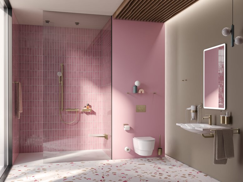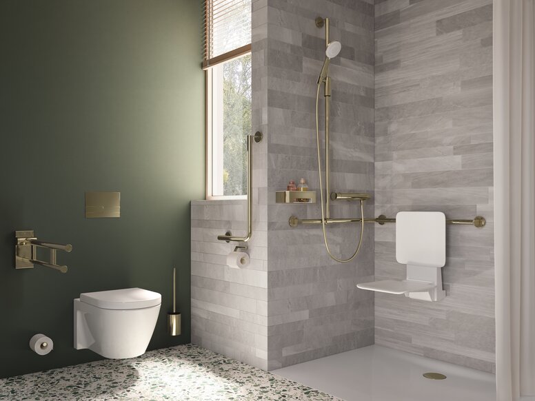 More glamour in the bathroom: Brass, bronze or gold are just some of the new metallic designer surfaces from HEWI that can be used to transform contemporary sanitary rooms into personalised oases of well-being – be it in hotels, in representative public buildings, in elective surgery areas in hospitals or in the bathroom at home. Altogether, the manufacturer is offering five colours in either brushed or glossy finishes for its accessible sanitaryware and accessories, all manufactured in the PVD process. This allows for even more diversity and scope for bathroom planning.