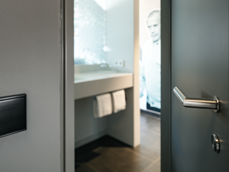 De deurkrukserie 162 van HEWI past bij de avant-gardistische architectuurstijl van het H4 Hotel in het Borussia Park. De elegante maar robuuste stijl van deze beslagserie creëert een uiterst aantrekkelijk effect op de deur.De puristische designoplossing van hendel 162 in de mini-versie reduceert de hendel tot het essentiële zonder aan functionaliteit in te boeten. Zelfs in de vrijstaande uitvoering maakt hij een edele indruk in de hotelbadkamer.