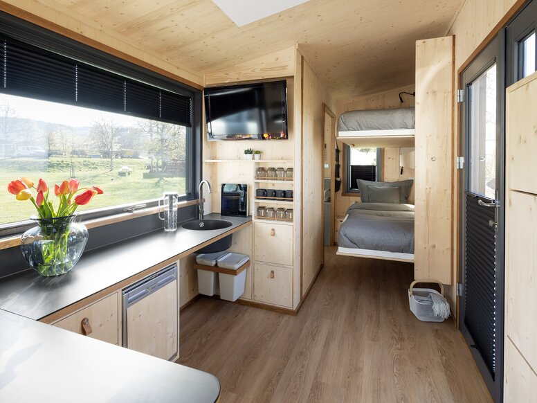 Christian Bock: Bij onze tiny houses ligt de nadruk duidelijk op de kwaliteit van leven. De aard van de materialen speelt een grote rol voor ons. Wij gebruiken voornamelijk natuurlijke en duurzame materialen voor onze minihuisjes, zoals hout en schapenwol. Wij letten er ook goed op, dat we zo duurzaam en ecologisch mogelijk werken. Sommige van onze tiny houses zijn tot op zekere hoogte ook mobiel en in beperkte mate transporteerbaar. Maar ze zijn niet te vergelijken met een camper bijvoorbeeld. In een tiny house heerst een ander leefklimaat. Je hebt slechts een beperkt woonoppervlak, dat je zo goed mogelijk moet proberen te benutten.