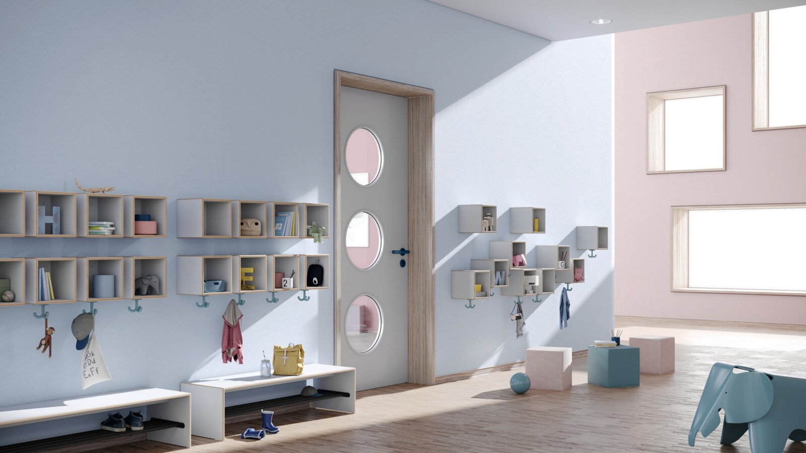 Licht en bewegingsvrijheid in de garderobe van het kinderdagverblijf