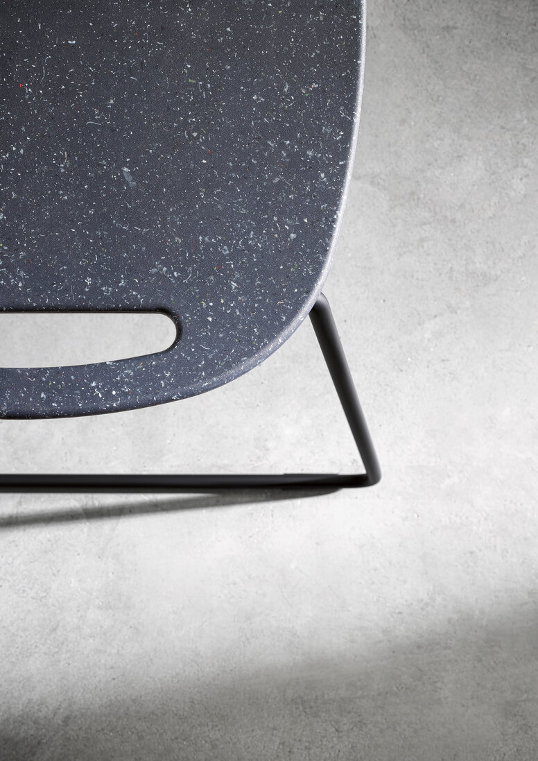 De krukken en stoelen van de duurzame Re-Stoelfamilie van HEWI zijn bijvoorbeeld gemaakt van post-industrieel recyclaat en vormen een statement voor het beste eco-design. In de natuurlijke kleuren bosgroen en donker granietgrijs overtuigt de Re-Sitzfamilie zowel haptisch als visueel met haar buitengewone look. Het bijzondere: HEWI maakt de Re-Sitzfamilie van gerecycled polypropyleen en gerecycled polyamide. Dat laatste produceert het bedrijf zelf, terwijl het eerstgenoemde wordt ingekocht bij een lokale leverancier, wat de de toeleveringsketen weer ten goede komt. Deze duurzame benadering betekent echter niet dat het ontwerp minder aandacht krijgt. Integendeel: Elke kruk is uniek omdat de gebruikte materialen een verschillend smeltpunt hebben, waardoor er tijdens het spuitgietproces een gevlekte structuur in het oppervlak ontstaat.