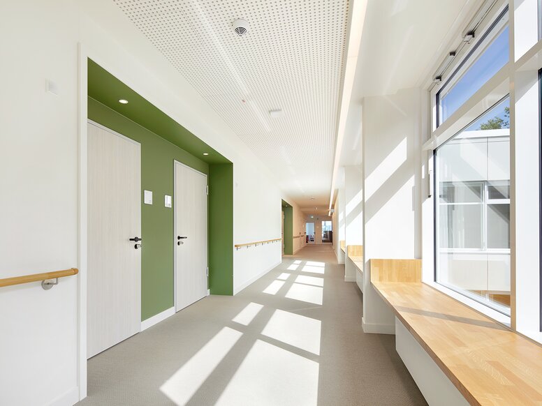 "Het behandelconcept is gericht op de realiteit van het leven en bereidt patiënten specifiek voor op het dagelijks leven”, legt Dr. Matthias Wilkening, managing partner van Wahrendorff, uit. Er zijn bijvoorbeeld verschillende trainingslocaties, zoals bijkeukens en een ‘wasserij’. De architectuur van het gebouw, met zijn slimme combinatie van binnen- en buitenruimtes en een verscheidenheid aan lounges en ontmoetingsruimtes zoals terrassen, loggia's, verlengstukken voor gangen en groepsruimten, voorziet in de behoefte van gasten aan een eigen toevluchtsoord of aan sociale interactie. Er zijn hier veel mogelijkheden om in je eigen tempo je weg terug te vinden naar het openbare leven.