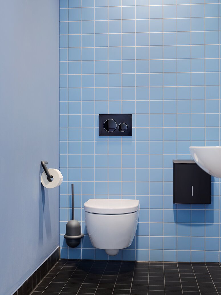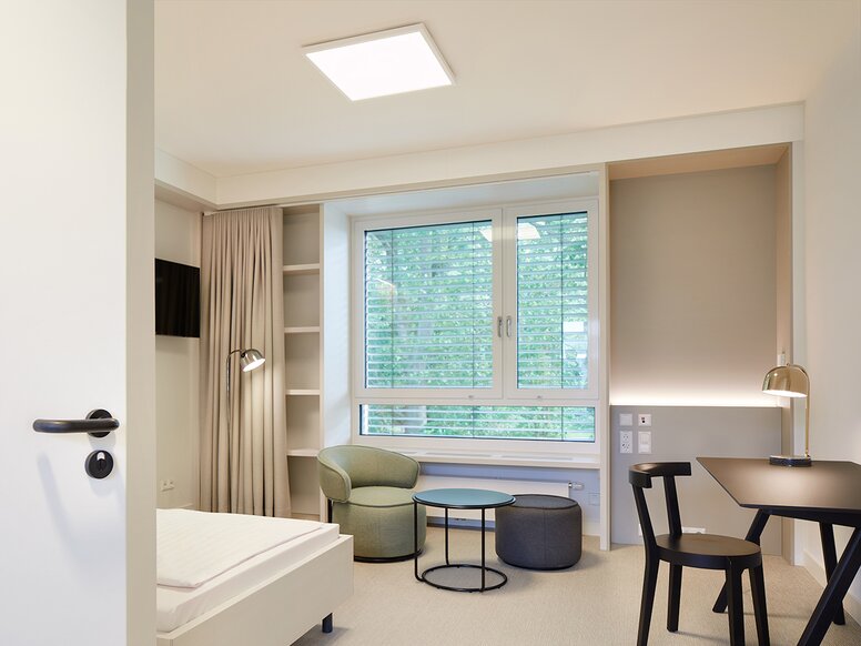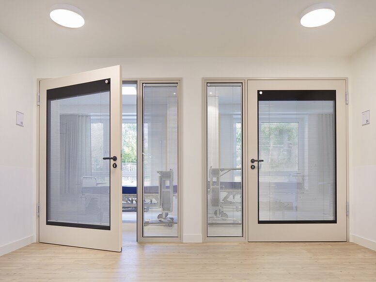 Op de kamerdeuren maakt de klassieke deurkruk van HEWI - Systeem 111 in een matzwarte afwerking - een statement. De tot de essentie teruggebrachte designtaal van de deurkruk past naadloos in de tijdloos moderne architectuur van het ziekenhuis en vormt tegelijkertijd een maximaal kleurcontrast met de witte deuren - soms in combinatie met een ronde WC- of sleutelrozet en in de optionele ruimtes met een elektronische sluitcilinder.