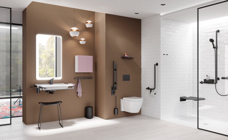 Eine zukunftssichere Badplanung sieht Montagevorbereitungen für Hilfsmittel wie Stützklappgriffe oder Duschsitze bereits in der Bau- oder Sanierungsphase vor – auch dann, wenn sie zunächst nicht installiert werden. HEWI bietet hierzu Systeme wie System 900, bei denen Haltevorrichtungen stilvoll vorgerüstet und bei Bedarf jederzeit ergänzt werden können.
