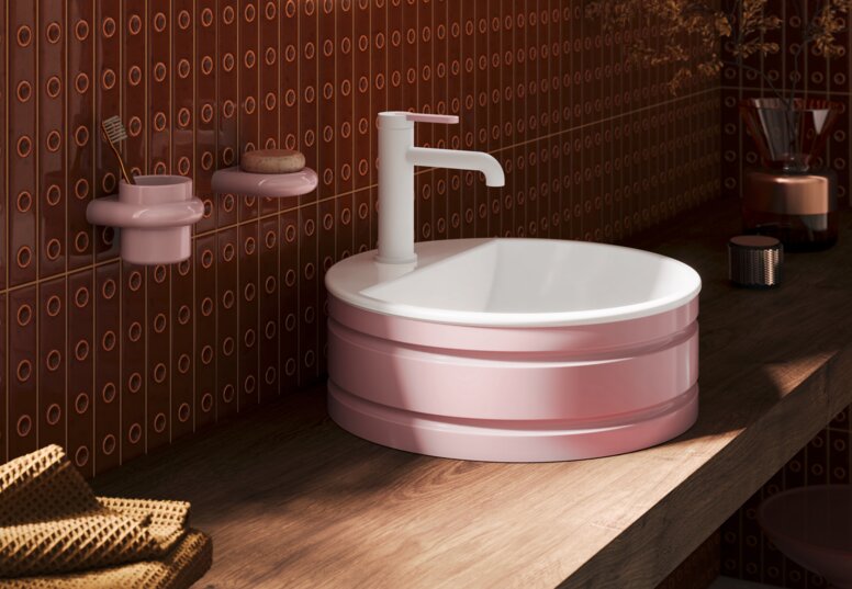 Ein feiner, aber prägender Aspekt der Badezimmer Trends 2026 ist die Rückkehr zu bewusst gesetzten Design-Highlights. Statt dekorativer Vielfalt stehen vermehrt einzelne, formstarke Elemente im Mittelpunkt. Geometrische Klarheit, ausgewogene Proportionen und markante Silhouetten setzen Akzente, die den Raum strukturieren und ihm Charakter verleihen. Besonders am Waschtisch zeigt sich, wie Form als gestalterisches Statement wirken kann.