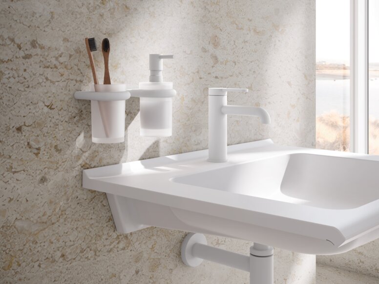 In Kombination mit präziser Formgebung und hochwertigen Materialien entsteht daraus eine Gestaltung, die reduziert wirkt, aber keineswegs zurückgenommen oder klinisch ist. Weiße Armaturen greifen diesen Gedanken auf. In ihrer matten Ausführung wirken sie dezent und präsent zugleich. Besonders in Verbindung mit weißen Waschtischen, WCs und Badewannen lässt sich ein durchgängiges Farbkonzept realisieren. Das Ergebnis ist ein ruhiges, geschlossenes Gesamtbild, das Weiß als verbindendes Designelement inszeniert.