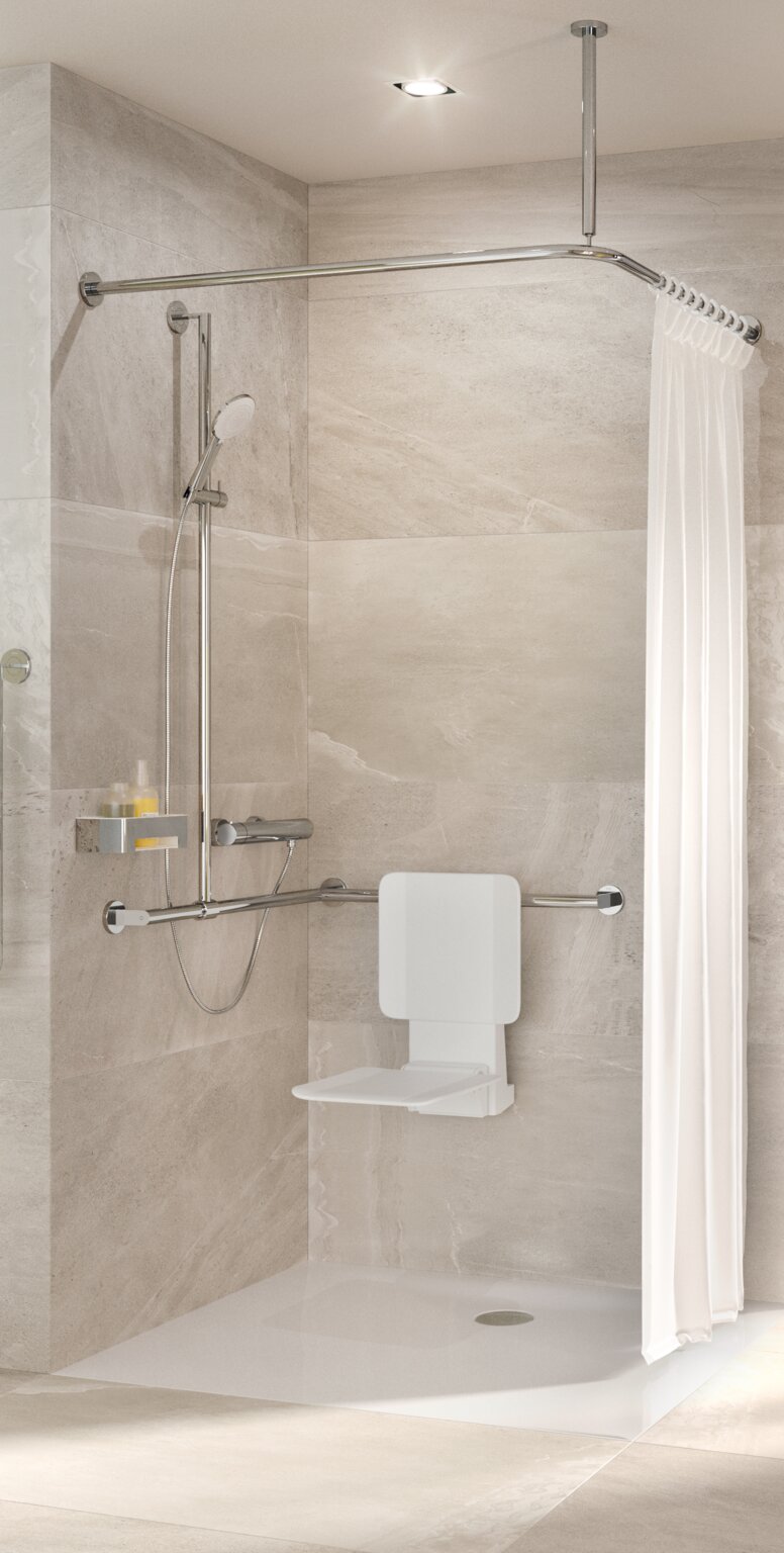 Auch in bestehenden Badezimmern lassen sich viele Maßnahmen unkompliziert umsetzen. Mobile Halte- und Stützklappgriffe oder klappbare Duschsitze erhöhen Sicherheit und Komfort und lassen sich je nach Bedarf nachrüsten ohne den Grundriss grundlegend zu verändern.
