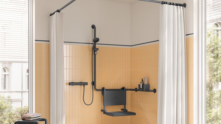 Farbakzente geben Impulse. Viele Menschen sind noch bis ins hohe Alter geistig sehr fit. Allerdings werden fast alle sukzessive unbeweglicher, haben weniger Kraft und hören und sehen nicht mehr so gut, da die Augenlinse verhärtet und trüb wird. Ältere Menschen nehmen allerdings Farb- und Helligkeitskontraste weiterhin sehr gut wahr. Gut geeignet für den Einsatz im barrierefreien Bad ist beispielsweise das System 900. Unser barrierefreies Sanitärsystem bietet mit seiner großen Farbvariation zahlreiche Gestaltungsmöglichkeiten. Alle Produkte der Sanitätsserie sind bis ins kleinste Detail durchdacht – so auch in der Farbgestaltung. Die Stützklappgriffe und Klappsitze sind sowohl in einer Chrom- und Edelstahloptik als auch mit einer matten Oberfläche verfügbar. Tiefmattes Weiß, Hellgrau Perlglimmer, Dunkelgrau Perlglimmer sowie Schwarz ermöglichen, starke Kontraste im seniorengerechten Bad zu setzen. Gleichzeitig bieten alle Produkte Sicherheit und Komfort. Hinzu kommen praktische Accessoires, die das System 900 perfekt ergänzen.