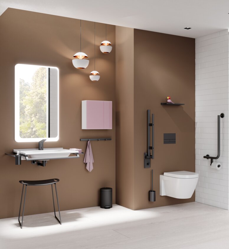 Neben der Funktionalität trägt auch die Gestaltung zur Barrierefreiheit bei. Klare Farbkontraste zwischen Boden, Wand und Sanitärobjekten erleichtern die Orientierung und helfen insbesondere Menschen mit eingeschränktem Sehvermögen. Beispielsweise kann ein dunkler Boden in Kombination mit hellen Wänden und farblich abgesetzten Waschtischen und WCs eine klare visuelle Struktur schaffen. Auch kontrastreiche Armaturen und Griffe erhöhen die Bedienfreundlichkeit und sorgen für ein Plus an Sicherheit im Alltag.