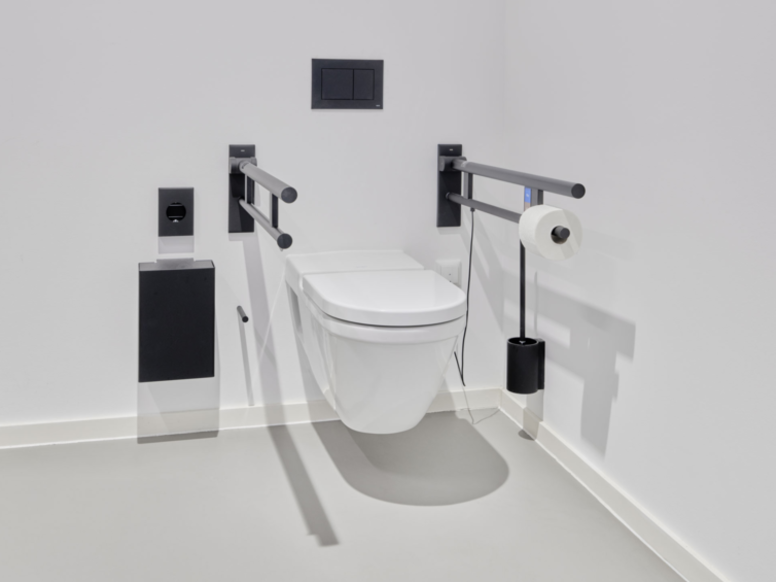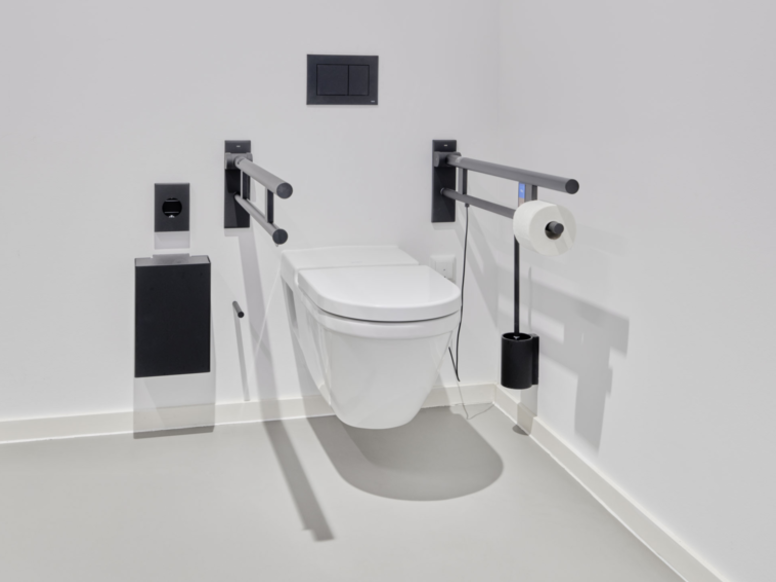 • System 900 (WC-Papierhalter, WC-Bürstengarnitur, Desinfektions- und Seifenspender, Seifenspender manuell, Sensoric Desinfektionsmittelspender, Papierhandtuchspender, Papierabfallbehälter, Abfallbehälter, Hygienebeutelspender, Stützklappgriffe)