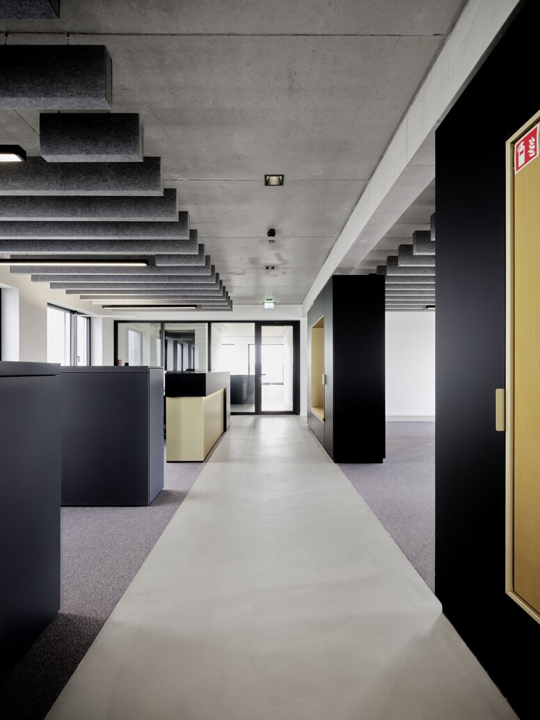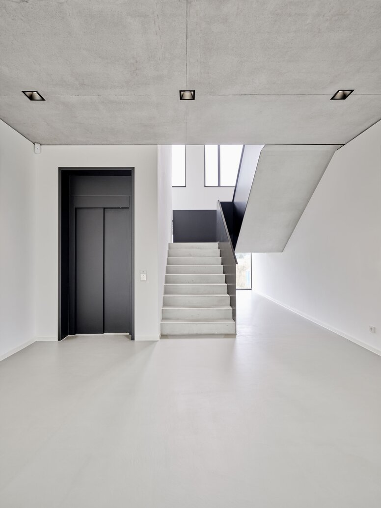 Im Inneren haben die Architekten klare Gestaltungsprinzipien völlig durchgängig implementiert. So strahlt die gesamte Produktionshalle in einem fast sakral wirkenden Weiß. „Wir haben sogar den Lastenkran weiß lackieren lassen“ erzählt Architektin Prof. Alexandra Röing genannt Nölke, und führt fort: „Ganz bewusst haben wir uns gegen die unruhige Optik entschieden, die man üblicherweise in Werkstätten und Produktionshallen vorfindet.“ Klarheit schaffen auch die übrigen Farben und Materialien. Weiß prägt die Produktion, Sichtbetonflächen und schwarze Elemente geben dem Verwaltungstrakt ein einheitliches, zurückhaltend-elegantes Gesicht.