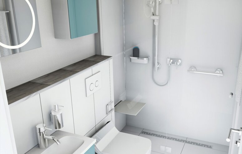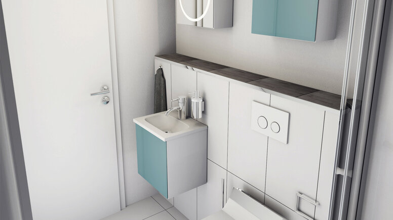 It doesn't take much space to turn bathrooms into an oasis of well-being. The design of floor and wall in similar materials and colours makes the bathroom appear larger. Large-format tiles and transparent elements, such as mirrors, provide brightness and width. With wall-mounted functional elements - e.g. the toilet brush - cleaning is easy and the room is visually enlarged.