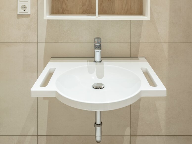 The HEWI washbasins with integrated accessibility are particularly useful. The shallow washbasin is accessible from underneath and practical grab rails provide reliable support.These can also be used as towel rails.