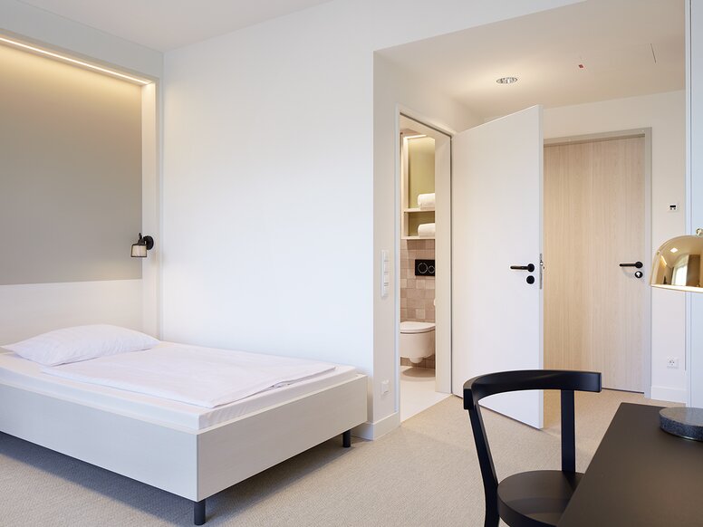 The guiding principle of the design by tsj Architekten was to create "a stimulating and varied environment as a healing environment for the body, mind and soul". All decentralised inpatient services were brought together in the architecturally successful new clinic building, enabling individualised therapies and many accompanying services. For consistent planning down to the last detail, the architectural firm opted for stylish solutions with maximum user comfort from HEWI.