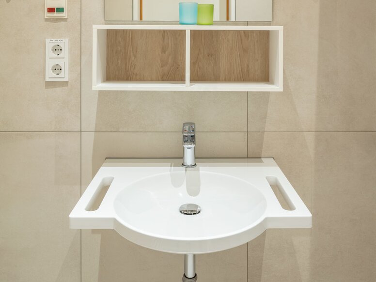The HEWI washbasins with integrated accessibility are particularly useful. The shallow washbasin can be moved underneath and practical grab rails provide reliable support. These can also be used as towel rails.