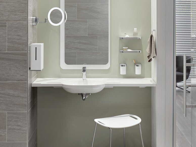 HEWI fittings are well thought-out down to the smallest detail and are characterised by a high level of operating convenience, easy cleaning, hygienic design, safe use and ease of maintenance. The HEWI Sensoric fittings enable a new way of washing hands without touching. A hand movement is enough to start the water flow and a preset time interval to let it end automatically. In this way, there is no contact and the transmission of germs is stopped. The build-up of germs inside is also prevented thanks to the integrated hygiene flush. The time of the flush is adjustable via an app. In this way, water resources can be saved and hygiene in sanitary rooms can be increased. In addition, the cleaning effort for the fittings is reduced. The sensor-controlled fittings are available with matt and glossy surfaces.