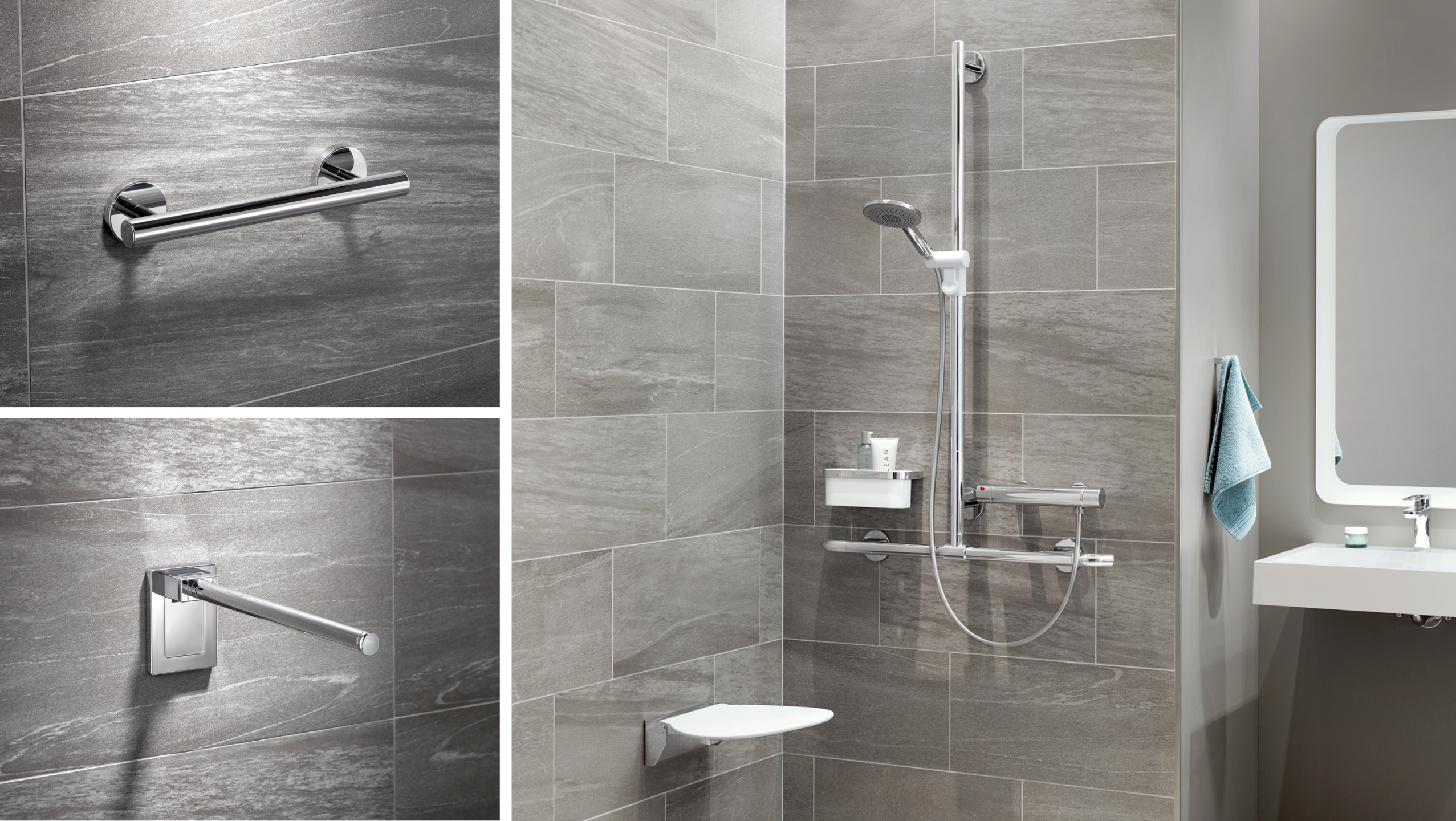 Avec le système 900, notre ligne d’accessoires de salle de bain et de produits d’assistance, de nombreuses possibilités d’aménagement s’ouvrent à vous pour rendre votre salle de bain accessible à tous et élégante. Que ce soit en version chromée, en acier inoxydable ou en version thermolaquée en blanc, gris ou noir, ces options assurent un look moderne à la salle de bain de vos rêves.