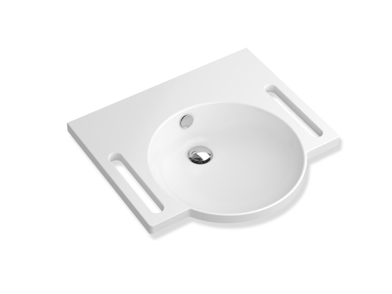 Une surface brillante facile à entretenir et un design fonctionnel sont les garants de la polyvalence des lavabos HEWI en résine minérale. Avec l'élargissement de la gamme, des dimensions supplémentaires de lavabos sont disponibles avec un trop-plein adaptatif et en combinaison avec des mains courantes. Les trop-pleins adaptatifs offrent un plus en matière d'hygiène, car ils peuvent être facilement installés sous le lavabo et remplacés si nécessaire.