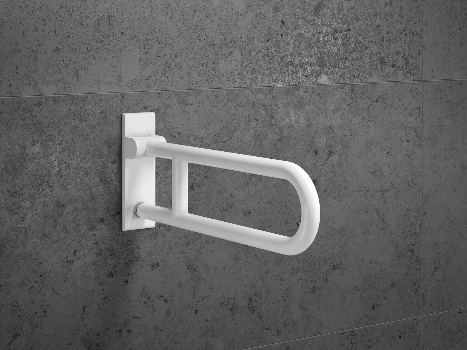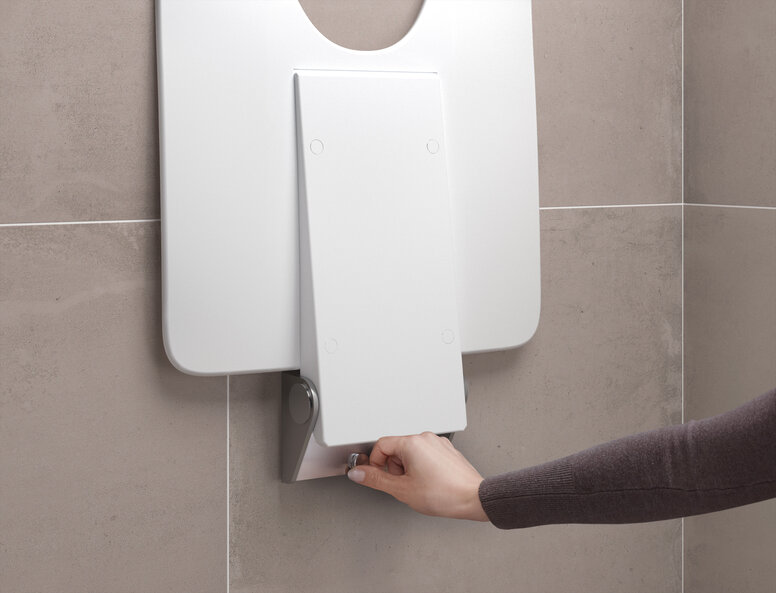 Les poignées de soutien mobiles pliables offrent non seulement un soutien et une assistance fiables pour les séquences de mouvements, mais aussi la possibilité d'être utilisées de manière flexible partout où elles sont nécessaires. Si nécessaire, la poignée de support pliante portable est simplement encliquetée dans la plaque de montage installée de façon permanente. Grâce à la connexion par encliquetage, le montage et le démontage sont possibles sans outils. Si la poignée de support pliante n'est pas nécessaire, la plaque de montage peut être recouverte d'un capuchon. Le rail de support mobile pliable est disponible en version mono et en version duo avec un deuxième niveau de poignée, qui offre un support optimal lors du retournement sur le côté des WC. La poignée de soutien mobile et pliable peut être complétée par des éléments de confort : par exemple, un coussin de bras peut être combiné pour un soutien encore plus confortable du bras. En outre, le rail de support mobile pliable peut être équipé d'un porte-rouleau de papier toilette avec déclenchement de la chasse d'eau et touche de fonction librement assignable.
