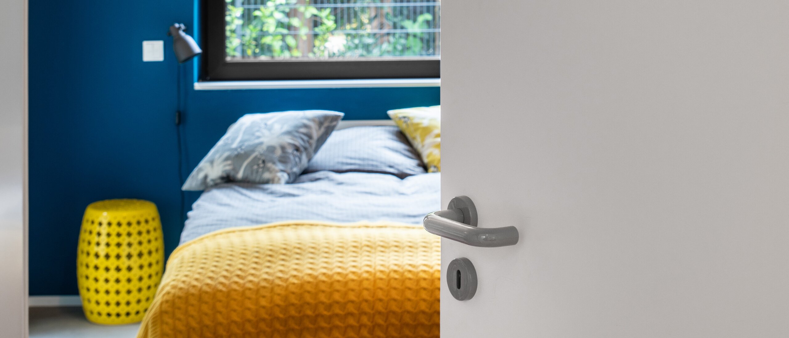 Voor de binnendeuren kozen de opdrachtgevers voor effen witte elementen met bijpassende kozijnen van Brüchert + Kärner. De deurgreep System 111 in verschillende kleuren werd overal gebruikt als accent op de deuren. Tegelijkertijd passen de deurkrukken perfect in het architectonische ontwerp en vormen zij een eenheid met de andere inrichtingen. Voor een holistische vormgeving werd bij de deurkrukken ook gebruik gemaakt van raambeslag van System 111 van HEWI.