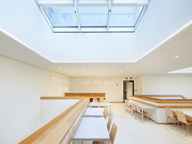 Naast de renovatie van het bestaande gebouw moest de bruikbare ruimte worden uitgebreid. De nieuw gecreëerde "Cube" is een vrijstaand gebouw op de binnenplaats, verspreid over drie verdiepingen en creëert ongeveer 900 vierkante meter ruimte voor extra werkplekken voor studenten en uitwisseling tussen de studieverenigingen. De nieuwe uitbreiding wordt gekenmerkt door een gepolijste roestvrijstalen gevel, die interessante effecten en visuele relaties creëert dankzij de reflecterende eigenschappen. De gevel draagt bij aan een harmonieus samenspel van oud en nieuw door de historische gevel te weerspiegelen en zich op een visueel ingetogen maar moderne manier te presenteren. Op de bovenste verdieping van het nieuwe gebouw bevindt zich een zaal die wordt overspoeld met licht en die samen met de vier college- en vergaderruimten op de begane grond, ook kan worden gebruikt voor evenementen. Het nieuwe gebouw is op de begane grond aan drie kanten via bruggen verbonden met het bestaande gebouw. Nieuw gecreëerde vergaderzalen in de monumentale hoofdfoyer en de gerenoveerde kantine met een open-ruimte-concept en nieuwe energiezuinige technische voorzieningen vullen het gebruik op de begane grond aan.