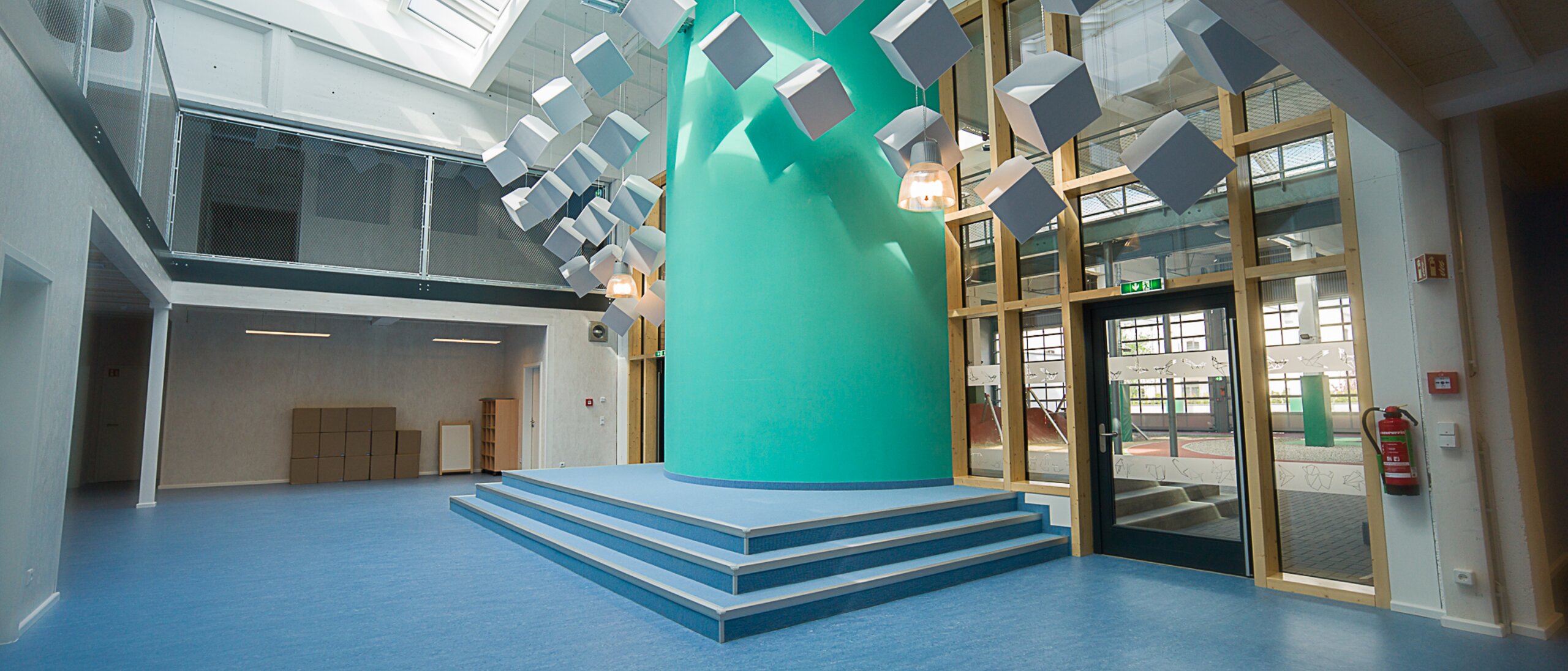 Pozostałe dwie trzecie całkowitej powierzchni zajmuje zadaszony arkadowy podcień, który jest połączony z częścią zewnętrzną sześcioma otwieranymi bramami rolowanymi. Na wewnętrznym placu zabaw jest wiele możliwości zabawy i ruchu dla najmłodszych: trampoliny, ścianka wspinaczkowa, piaskowy plac zabaw z ramą wspinaczkową w kształcie pająka i tor hulajnogi w kształcie ósemki. Gdy bramy są otwarte, przejście na teren zewnętrzny jest płynne, a dzieci mogą korzystać z nawierzchni z naturalnej trawy i wielofunkcyjnego boiska do różnych sportów, takich jak piłka ręczna, piłka nożna czy koszykówka