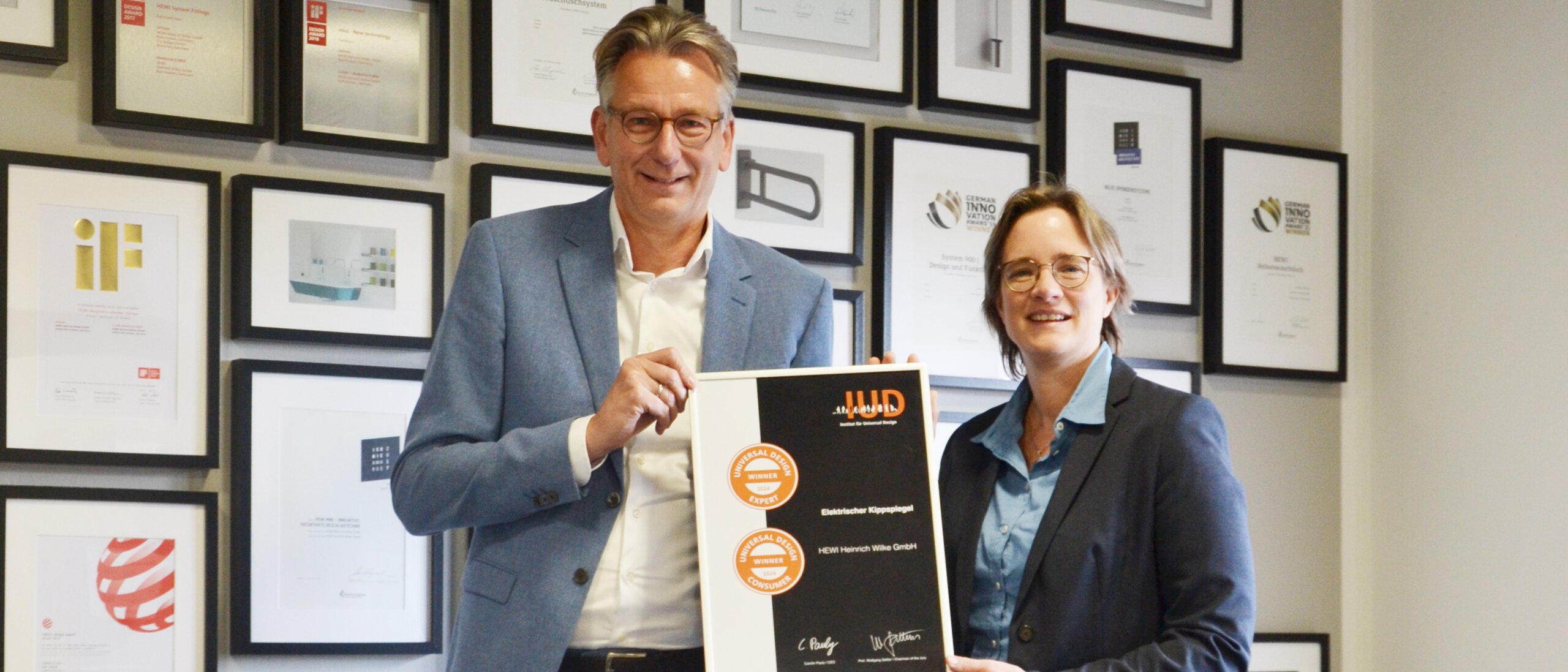Lustro uchylne z silniczkiem od HEWI uhonorowano dwukrotnie nagrodą Universal Design Award 2024 "Winner": Otrzymało zarówno Expert Award jak i Consumer Award. Rozwiązanie przekonało nie tylko jury eksperckie pod przewodnictwem prof. Wolfganga Sattlera, ale także około 100 odwiedzających Hephata Festtage, którzy oddali swoje głosy w ramach jury konsumenckiego.