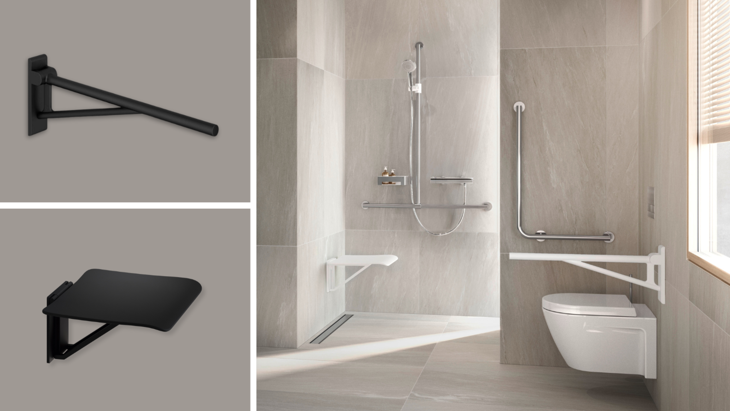System 162 można idealnie łączyć z uniwersalnymi produktami w klasycznej czerni i bieli. Warianty kolorystyczne otwierają szeroką gamę opcji projektowych, które można harmonijnie zintegrować z każdą łazienką. Składane siedzisko prysznicowe i składany uchwyt zapewniają maksymalny komfort i bezpieczeństwo oraz mogą być elastycznie dostosowywane do różnych potrzeb.